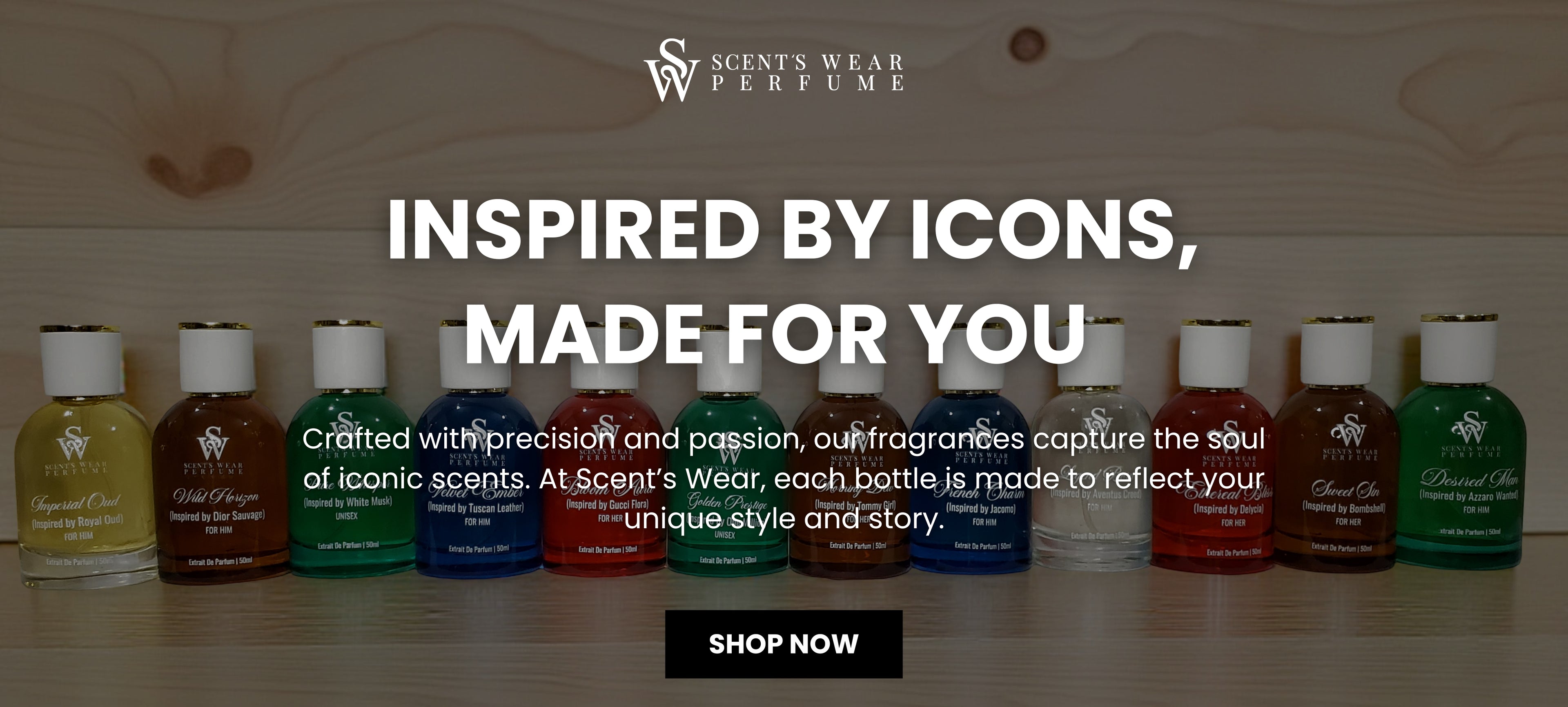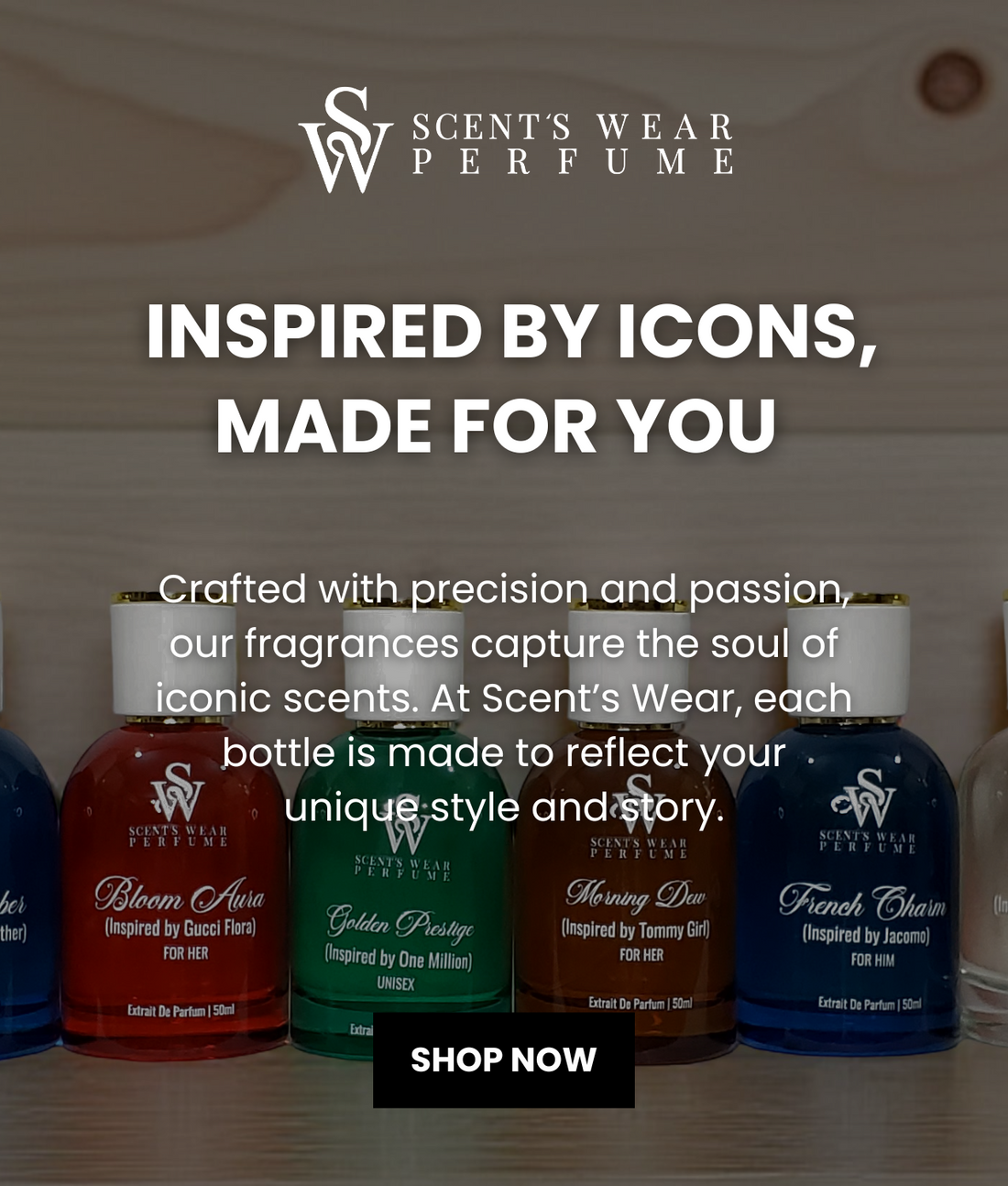 At Scent’s Wear, we believe scent is more than a luxury—it's a memory, a mood, a message. Our perfumes are inspired by world-renowned designer fragrances and thoughtfully crafted to match your unique personality and style. Whether bold, elegant, or playful, there’s a scent in our collection that speaks to you. Experience premium quality, long-lasting performance, and affordable luxury—all in one bottle.